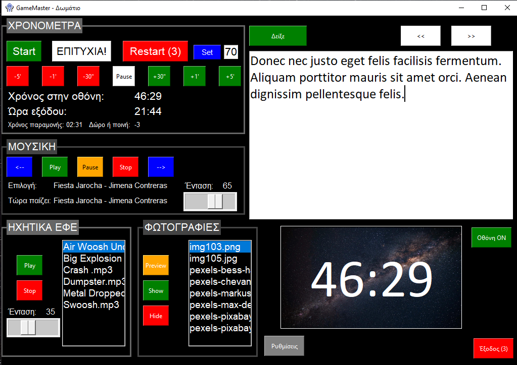 - Μεταφορά μουσικής παρασκηνίου με αυτόματη επανάληψη και ήχων από εφέ με αυτόματο fade out και fade in της μουσικής